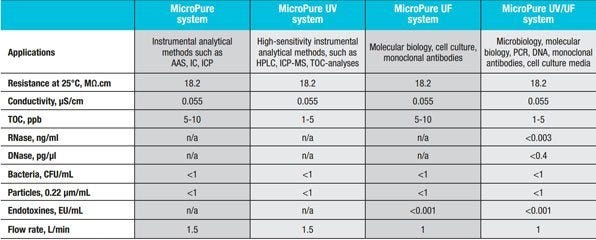 Compare Barnstead MicroPure Systems for ASTM Type 1 Ultra-Pure Water